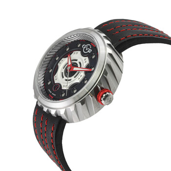 Silver-tone stainless steel case with a black leather strap. Fixed silver-tone stainless steel bezel. Black dial with red hands and index hour markers. Dial Type: Analog. Luminescent hands. Date display at the 6 o'clock position. Sellita Caliber SW200-1 Automatic movement, containing 26 Jewels, bitting at 28800 vph, and has a power reserve of approximately 38 hours. Scratch resistant sapphire crystal. Pull / push crown. Transparent case back. Round case shape, case size: 43 mm, case thickness: 14 mm. Band width: 18 mm. Deployment with push button release clasp. Water resistant at 50 meters / 165 feet. Functions: date, hour, minute, second. Motorcycle Series. Luxury watch style. Watch label: Swiss Made. GV2 by Gevril Motorcycle Black Dial Men's Watch 13200.