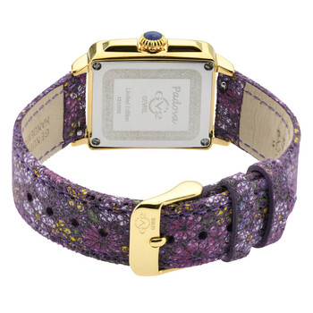 Yellow gold-tone stainless steel case with a purple genuine leather strap. Fixed yellow gold-tone stainless steel bezel. Mother of pearl dial with yellow gold-tone hands and Roman numeral hour markers. Dial Type: Analog. Ronda 762 quartz movement. Scratch resistant sapphire crystal. Pull / push crown. Solid case back. Rectangle case shape, case size: 27 mm, case thickness: 9.5 mm. Band width: 18 mm. Buckle clasp. Water resistant at 30 meters / 100 feet. Functions: hour, minute. Padova Floral Series. Luxury watch style. Watch label: Swiss Quartz. GV2 by Gevril Padova Floral Mother of Pearl Dial Ladies Watch 12305F.