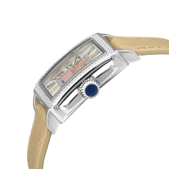 Stainless steel case with a tan (saffiano) leather strap. Fixed (diamond-cut) stainless steel bezel. White (diamondl-set) dial with gold-tone sword-shaped hands and Roman numeral hour markers. Diamond-set index marker at the 6 o'clock position. Dial Type: Analog. Quartz movement. Scratch resistant sapphire crystal. Pull / push crown. Solid case back. Square case shape. Case size: 28.5 mm. Case thickness: 9.5 mm. Band width: 18 mm. Tang clasp. Water resistant at 30 meters / 100 feet. Functions: hour, minute. Padova Series. Fashion watch style. Watch label: Swiss Made. GV2 by Gevril Padova Quartz Diamond White Dial Ladies Watch 12304.