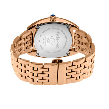 Rose gold-tone stainless steel case and bracelet. Fixed rose gold-tone stainless steel bezel. Mother of pearl dial with rose gold-tone hands and diamond hour markers. Minute markers around the outer rim. Dial Type: Analog. Quartz movement. Scratch resistant sapphire crystal. Pull / push crown. Solid case back. Round case shape, case size: 35 mm, case thickness: 8.5 mm. Band width: 17 mm. Deployment with push button release clasp. Water resistant at 50 meters / 165 feet. Functions: hour, minute, second. Additional Info: 8 diamonds and 8 gemstones. Palermo Series. Fashion watch style. GV2 by Gevril Palermo Diamond Mother of Pearl Dial Ladies Watch 13103B.
