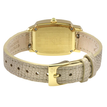 Gold-tone stainless steel case with a beige leather strap. Fixed yellow gold-tone bezel. Mother of pearl dial with yellow gold-tone hands and diamond hour markers. Dial Type: Analog. Ronda Caliber 762 quartz movement. Scratch resistant sapphire crystal. Pull / push crown. Solid case back. Rectangle case shape, case size: 29 mm, case thickness: 7 mm. Band width: 12.5 mm, band length: 7.5 inches. Buckle clasp. Water resistant at 30 meters / 100 feet. Functions: hour, minute. Pavia Series. Fashion watch style. Watch label: Swiss Movt. GV2 by Gevril Pavia Diamond Mother of Pearl Dial Ladies Watch 13404.