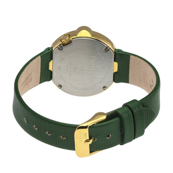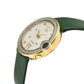 Yellow gold-tone stainless steel case with a green leather strap. Fixed yellow gold-tone stainless steel bezel. White dial with yellow gold-tone hands and Roman numeral hour markers. Dial Type: Analog. Ronda Caliber 762 quartz movement. Scratch resistant sapphire crystal. Pull / push crown. Solid case back. Round case shape, case size: 33 mm, case thickness: 9 mm. Band width: 16 mm. Buckle clasp. Water resistant at 50 meters / 165 feet. Functions: hour, minute. Perugia Series. Fashion watch style. Watch label: Swiss Movt. GV2 by Gevril Perugia White Dial Ladies Watch 14702.