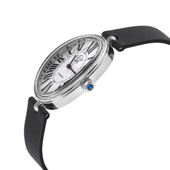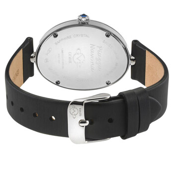 Silver-tone stainless steel case with a black leather strap. Fixed silver-tone stainless steel bezel. White dial with black hands and Roman numeral hour markers. Minute scale around the inner rim. Dial Type: Analog. Ronda Caliber 1062 quartz movement. Scratch resistant sapphire crystal. Pull / push crown. Solid case back. Oval case shape, case size: 38 mm. Band width: 16 mm, band length: 7.5 inches. Buckle clasp. Water resistant at 50 meters / 165 feet. Functions: hour, minute. Piazza Navona Series. Fashion watch style. Watch label: Swiss Movt. GV2 by Gevril Piazza Navona White Dial Ladies Watch 14800.