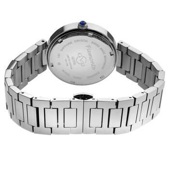 Silver-tone stainless steel case and bracelet. Fixed silver-tone stainless steel bezel. White dial with blue hands and Arabic numeral hour markers. Minute scale around the inner rim. Dial Type: Analog. Quartz movement. Scratch resistant sapphire crystal. Pull / push crown. Solid case back. Round case shape, case size: 36 mm, case thickness: 8 mm. Band width: 18 mm. Deployment with push button release clasp. Water resistant at 50 meters / 165 feet. Functions: hour, minute, second. Additional Info: 12 diamonds. Piemonte Series. Fashion watch style. GV2 by Gevril Piemonte White Dial Ladies Watch 14200B.