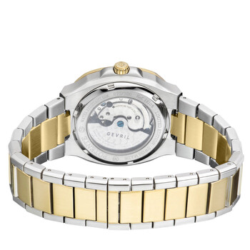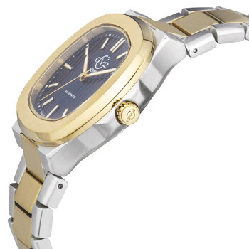Stainless steel case with a two-tone (silver-tone and yellow gold-tone) stainless steel bracelet. Fixed yellow gold-tone bezel. Blue dial with yellow gold-tone hands and index hour markers. Minute markers around the outer rim. Dial Type: Analog. Luminescent hands and markers. Date display at the 3 o'clock position. Automatic movement. Scratch resistant sapphire crystal. Pull / push crown. Transparent case back. Cushion case shape. Case size: 40 mm. Case thickness: 12.5 mm. Band width: 20 mm. Deployment clasp with a push button release. Water resistant at 200 meters / 660 feet. Functions: date, hour, minute, second. Potente Series. Luxury watch style. Watch label: Swiss Made. GV2 by Gevril Potente Automatic Blue Dial Men's Watch 18106.