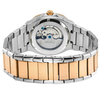 Silver-tone stainless steel case with a two-tone (silver-tone and rose gold-tone) stainless steel bracelet. Fixed rose gold-tone stainless steel bezel. Multi-color dial with rose gold-tone hands and index hour markers. Minute markers around the outer rim. Dial Type: Analog. Luminescent hands and markers. Date display at the 3 o'clock position. Automatic movement. Scratch resistant sapphire crystal. Pull / push crown. Transparent see through case back. Cushion case shape, case size: 40 mm, case thickness: 12.5 mm. Band width: 20 mm. Deployment with push button release clasp. Water resistant at 50 meters / 165 feet. Functions: date, hour, minute, second. Potente Series. Luxury watch style. Watch label: Swiss Made. GV2 by Gevril Potente Multi-Color Dial Men's Watch 18116B.