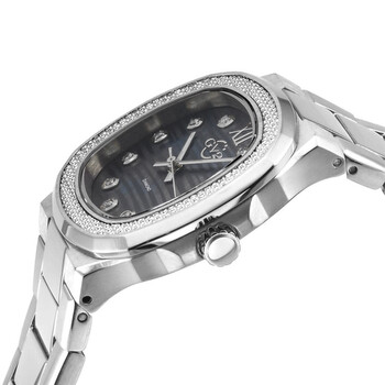 Silver-tone stainless steel case and bracelet. Fixed silver-tone stainless steel bezel. Mother of pearl dial with silver-tone hands and diamond hour markers. Dial Type: Analog. Luminescent hands. Quartz movement. Scratch resistant sapphire crystal. Pull / push crown. Solid case back. Cushion case shape, case size: 33 mm, case thickness: 8.5 mm. Band width: 16 mm. Deployment with push button release clasp. Water resistant at 50 meters / 165 feet. Functions: hour, minute, second. Additional Info: 11 diamonds. Potente Series. Fashion watch style. GV2 by Gevril Potente Quartz Diamond Ladies Watch 18200B.