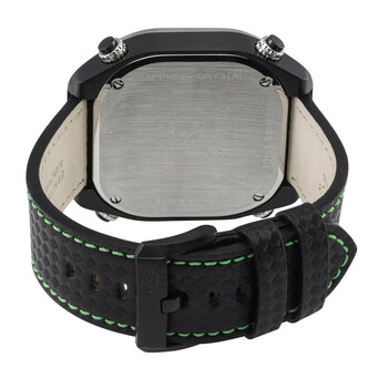Black stainless steel case with a black leather strap. Fixed silver-tone stainless steel bezel. Black dial with black hands and Arabic numeral hour markers. Minute markers around the outer rim. Dial Type: Analog. Luminescent hands and markers. Ronda Caliber 751 quartz movement. Scratch resistant sapphire crystal. Pull / push crown. Solid case back. Octagon case shape, case size: 54 mm, case thickness: 12 mm. Band width: 22 mm. Buckle clasp. Water resistant at 30 meters / 100 feet. Functions: hour, minute. Quattro Series. Luxury watch style. Watch label: Swiss Made. GV2 by Gevril Quattro Quartz Black Dial Men's Watch 43401.