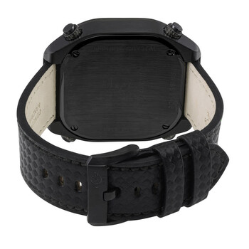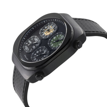 Black stainless steel case with a black leather strap. Fixed black stainless steel bezel. Black dial with black hands and Arabic numeral hour markers. Minute markers around the outer rim. Dial Type: Analog. Luminescent hands and markers. Ronda Caliber 751 quartz movement. Scratch resistant sapphire crystal. Pull / push crown. Solid case back. Octagon case shape, case size: 54 mm, case thickness: 12 mm. Band width: 22 mm. Buckle clasp. Water resistant at 30 meters / 100 feet. Functions: hour, minute. Quattro Series. Luxury watch style. Watch label: Swiss Made. GV2 by Gevril Quattro Quartz Black Dial Men's Watch 43403.