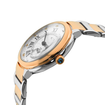 Rose gold-tone stainless steel case with a two-tone (silver-tone and rose gold-tone) stainless steel bracelet. Fixed rose gold-tone bezel. White (crystal-set) dial with blue sword-shaped hands and black Roman numeral / diamond hour markers. Minute markers around the outer rim. Dial Type: Analog. Small seconds sub-dial. Ronda caliber 1069 quartz movement. Scratch resistant sapphire crystal. Pull / push crown. Solid case back. Round case shape. Case size: 36 mm. Case thickness: 13 mm. Band width: 16 mm. Deployment clasp with a push button release. Water resistant at 30 meters / 100 feet. Functions: hour, minute, second. Rome Series. Fashion watch style. Watch label: Swiss Movt. GV2 by Gevril Rome Quartz Diamond White Dial Ladies Watch 12204B.