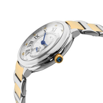 Stainless steel case with a two-tone (silver-tone and yellow gold-tone) stainless steel bracelet. Fixed stainless steel bezel. White (crystal-set) dial with blue hands and Roman numeral hour markers. Minute markers around the outer rim. Dial Type: Analog. Small seconds sub-dial. Ronda 1069 Swiss Quartz quartz movement. Scratch resistant sapphire crystal. Pull / push crown. Solid case back. Round case shape. Case size: 36 mm. Case thickness: 13 mm. Band width: 16 mm. Deployment clasp with a push button release. Water resistant at 30 meters / 100 feet. Functions: hour, minute, second. Fashion watch style. GV2 by Gevril Rome Quartz White Dial Ladies Watch 12203B.