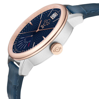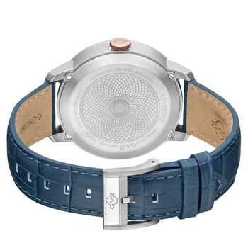 Silver-tone stainless steel case with a blue genuine leather strap. Fixed rose gold-tone stainless steel bezel. Blue dial with rose gold-tone hands and index hour markers. Minute markers around the outer rim. Dial Type: Analog. Date display at the 12 o'clock position. Ronda Caliber 7003.L quartz movement. Scratch resistant sapphire crystal. Pull / push crown. Solid case back. Round case shape, case size: 42 mm, case thickness: 13 mm. Band width: 18 mm. Buckle clasp. Water resistant at 50 meters / 165 feet. Functions: date, day, hour, minute, second. Additional Info: day indicator, large date window at 12 o'clock. Rovescio Series. Luxury watch style. Watch label: Swiss Made. GV2 by Gevril Rovescio Blue Dial Men's Watch 56205.