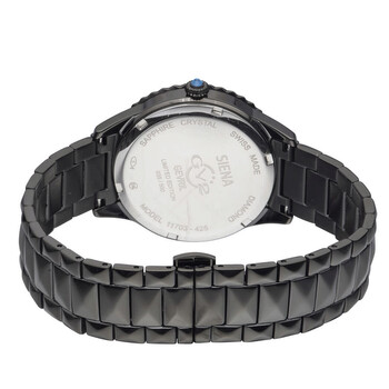 Black-plated stainless steel case and bracelet. Fixed black-plated bezel. Black dial with silver-tone hands and index hour markers. Diamonds set atthe 3, 6, 9 and 12 o'clock positions. Dial Type: Analog. Ronda Caliber 762 quartz movement. Scratch resistant sapphire crystal. Pull / push crown. Solid case back. Round case shape. Case size: 38 mm. Case thickness: 9 mm. Band width: 18 mm. Band length: 7 inches. Deployment clasp with a push button release. Water resistant at 3 meters / 10 feet. Functions: hour, minute. Siena Series. Fashion watch style. Watch label: Swiss Made. GV2 by Gevril Siena Quartz Black Dial Diamond Ladies Watch 11703-425.
