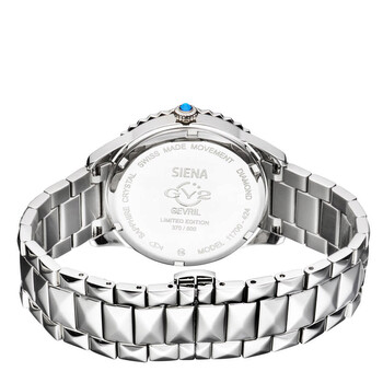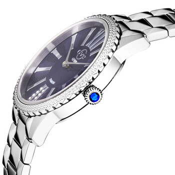 Silver-tone stainless steel case and bracelet. Fixed silver-tone stainless steel bezel. Blue dial with silver-tone hands and Roman numeral & index hour markers. Dial Type: Analog. Luminescent hands. Ronda Caliber 762 quartz movement. Scratch resistant sapphire crystal. Pull / push crown. Solid case back. Round case shape, case size: 37 mm, case thickness: 9 mm. Band width: 18 mm. Deployment with push button release clasp. Water resistant at 30 meters / 100 feet. Functions: hour, minute. Siena Series. Fashion watch style. Watch label: Swiss Movt. GV2 by Gevril Siena Quartz Blue Dial Ladies Watch 11722.