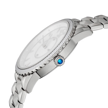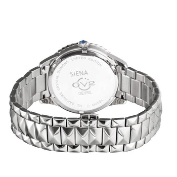 Stainless steel case with a stainless steel bracelet. Fixed (diamond-cut) stainless steel bezel. Mother of pearl dial with silver-tone hands and index hour markers. Dial Type: Analog. Quartz movement. Scratch resistant sapphire crystal. Pull / push crown set with a single blue cabochon. Solid case back. Round case shape. Case size: 38 mm. Case thickness: 9 mm. Band width: 18 mm. Deployment clasp with a push button release. Water resistant at 30 meters / 100 feet. Functions: hour, minute. Siena Series. Fashion watch style. GV2 by Gevril Siena Quartz Diamond Ladies Watch 11700-424.