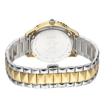 Gold-tone stainless steel case with a two-tone (silver-tone and gold-tone) stainless steel bracelet. Fixed (diamond-cut) gold-tone bezel. Silver dial with gold-tone hands and index hour markers. Diamonds set at the 3, 6, 9 and 12 o'clock positions. Dial Type: Analog. Quartz movement. Scratch resistant sapphire crystal. Pull / push crown set with a blue cabochon. Solid case back. Round case shape. Case size: 38 mm. Case thickness: 9 mm. Band width: 18 mm. Band length: 7 inches. Deployment with push button release clasp. Water resistant at 3 meters / 10 feet. Functions: hour, minute. Siena Series. Fashion watch style. GV2 by Gevril Siena Quartz Silver Dial Diamond Ladies Watch 11704-425.