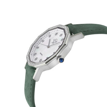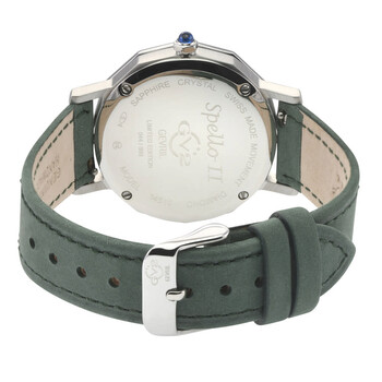 Silver-tone stainless steel case with a black leather strap. Fixed silver-tone stainless steel bezel. Mother of pearl dial with silver-tone hands and diamond hour markers. Minute markers around the outer rim. Dial Type: Analog. Ronda Caliber 763 quartz movement. Scratch resistant sapphire crystal. Pull / push crown. Solid case back. Dodecagon case shape, case size: 36 mm, case thickness: 8 mm. Band width: 18 mm, band length: 7.5 inches. Buckle clasp. Water resistant at 30 meters / 100 feet. Functions: hour, minute, second. Spello II Series. Fashion watch style. Watch label: Swiss Movt. GV2 by Gevril Spello Ii Diamond Mother of Pearl Dial Ladies Watch 14510.