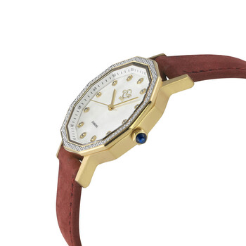 Gold-tone stainless steel case with a blue leather strap. Fixed yellow gold-tone stainless steel bezel. Mother of pearl dial with yellow gold-tone hands and diamond hour markers. Minute markers around the outer rim. Dial Type: Analog. Ronda Caliber 763 quartz movement. Scratch resistant sapphire crystal. Pull / push crown. Solid case back. Dodecagon case shape, case size: 36 mm, case thickness: 8 mm. Band width: 18 mm, band length: 7.5 inches. Buckle clasp. Water resistant at 30 meters / 100 feet. Functions: hour, minute, second. Spello II Series. Fashion watch style. Watch label: Swiss Movt. GV2 by Gevril Spello Ii Diamond Mother of Pearl Dial Ladies Watch 14511.