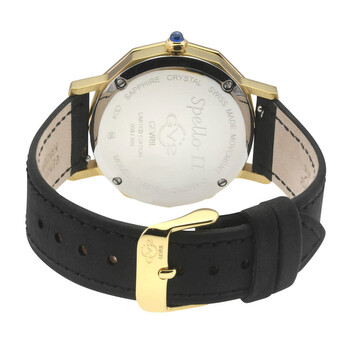 Gold-tone stainless steel case with a black leather strap. Fixed yellow gold-tone stainless steel bezel. Mother of pearl dial with yellow gold-tone hands and diamond hour markers. Minute markers around the outer rim. Dial Type: Analog. Ronda Caliber 763 quartz movement. Scratch resistant sapphire crystal. Pull / push crown. Solid case back. Dodecagon case shape, case size: 36 mm, case thickness: 8 mm. Band width: 18 mm, band length: 7.5 inches. Buckle clasp. Water resistant at 30 meters / 100 feet. Functions: hour, minute, second. Spello II Series. Fashion watch style. Watch label: Swiss Movt. GV2 by Gevril Spello Ii Diamond Mother of Pearl Dial Ladies Watch 14515.