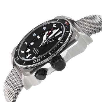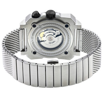 Silver-tone stainless steel case and bracelet. Uni-directional rotating black stainless steel bezel. Black dial with silver-tone hands and index hour markers. Minute markers around the outer rim. Dial Type: Analog. Luminescent hands and markers. Date display between 4 and 5 o'clock position. Sellita Calibre SW 220 Automatic movement, containing 26 Jewels, bitting at 28800 vph, and has a power reserve of approximately 38 hours. Scratch resistant sapphire crystal. Screw down crown. Transparent case back. Square case shape, case size: 44 mm, case thickness: 13 mm. Band width: 22 mm. Deployment with push button release clasp. Water resistant at 100 meters / 330 feet. Functions: date, hour, minute, second. Additional Info: dual time zone inner rotating bezel. Xo Submarine Series. Fashion watch style. Watch label: Swiss Made. GV2 by Gevril XO Submarine Automatic Black Dial Men's Watch 4541B.