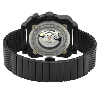 Black-plated stainless steel case with a black-plated stainless steel mesh bracelet. Uni-directional rotating black-plated bezel. Black dial with silver-tone hands and dot / Arabic numeral hour markers. Minute markers. Dial Type: Analog. Luminescent hands and markers. Date display between the 4 and 5 o'clock positions. Sellita Calibre SW 220 Automatic movement, containing 26 Jewels, bitting at 28800 vph, and has a power reserve of approximately 38 hours. Scratch resistant sapphire crystal. Screw down crown. Transparent case back. Square case shape, case size: 44 mm, case thickness: 13 mm. Band width: 22 mm. Deployment with push button release clasp. Water resistant at 100 meters / 330 feet. Functions: date, hour, minute, second. Additional Info: dual time zone inner rotating bezel. Xo Submarine Series. Fashion watch style. Watch label: Swiss Made. GV2 by Gevril XO Submarine Automatic Black Dial Men's Watch 4546B.