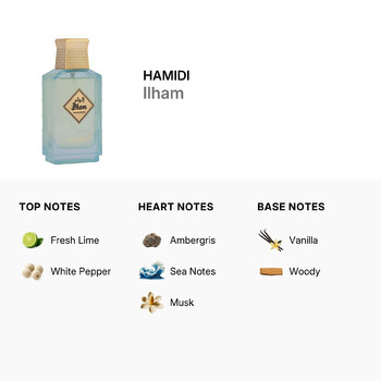 Ilham opens with a vibrant splash of fresh lime and the spicy kick of white pepper, creating an energetic and refreshing start. As the scent unfolds, the heart reveals a smooth blend of ambergris, sea notes, and musk—evoking the power of the ocean and the mystery of the unknown. Finally, warm vanilla and rich woody notes anchor the fragrance with depth and elegance, making it perfect for day or night.