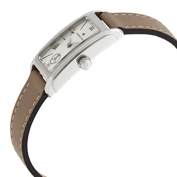 Stainless steel case with a brown leather strap. Fixed stainless steel bezel. Silver dial with silver-tone hands and alternating Roman numeral and index hour markers. Dial Type: Analog. Small seconds sub-dial. ETA caliber 980.153 quartz movement. Scratch resistant mineral crystal. Pull / push crown. Solid case back. Rectangle case shape. Case dimensions: 18,7 mm x 27 mm. Case thickness: 7 mm. Strap width: 14 mm. Tang clasp. Water resistant at 30 meters / 100 feet. Functions: hour, minute, small second. American Classic Ardmore Series. Casual watch style. Watch label: Swiss Made. Hamilton American Classic Ardmore Ladies Watch H11221514.