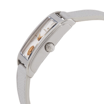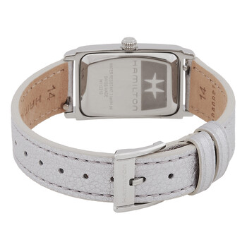 Silver-tone stainless steel case with a metallic silver leather strap. Fixed silver-tone stainless steel bezel. Silver dial with gold-tone hands and alternating Roman numeral and index hour markers. Dial Type: Analog. One subdial displaying: small second. ETA Caliber 980.163 quartz movement. Scratch resistant mineral crystal. Pull / push crown. Solid case back. Rectangle case shape, case size: 18.7 mm x 27 mm. Band width: 14 mm. Buckle clasp. Water resistant at 30 meters / 100 feet. Functions: hour, minute, small second. American Classic Ardmore Series. Casual watch style. Watch label: Swiss Made. Hamilton American Classic Ardmore Quartz Silver Dial Ladies Watch H11221850.