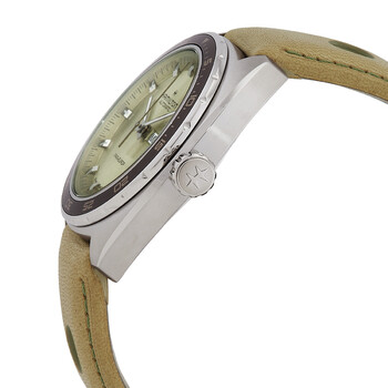 Silver-tone stainless steel case with a sage green leather strap. Uni-directional rotating silver-tone stainless steel bezel. Green dial with silver-tone hands and index hour markers. Minute markers around the outer rim. Dial Type: Analog. Luminescent hands and markers. Day of the week and date display at the 3 o'clock position. Hamilton Calibre H-30 Automatic movement, based upon ETA C07.111, containing 25 Jewels, bitting at 21600 vph, and has a power reserve of approximately 80 hours. Scratch resistant sapphire crystal. Transparent case back. Cushion case shape, case size: 42 mm, case thickness: 11.55 mm. Band width: 22 mm. Fold over clasp with a safety release. Water resistant at 50 meters / 165 feet. Functions: date, day, hour, minute, second. American Classic Series. Sport watch style. Watch label: Swiss Made. Hamilton American Classic Automatic Green Dial Men's Watch H35445860.