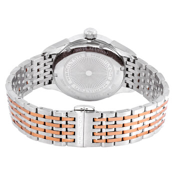 Stainless steel case with a two-tone (silver-tone and rose gold PVD) stainless steel bracelet. Fixed rose gold PVD bezel. Silver dial with rose gold-tone hands and Roman numeral hour markers. Minute markers around the outer rim. Dial Type: Analog. Date display at the 3 o'clock position. Hamilton calibre H-10 automatic movement, based upon ETA C07.111, containing 25 Jewels, bitting at 21600 vph, and has a power reserve of approximately 80 hours. Scratch resistant sapphire crystal. Pull / push crown. Solid case back. Round case shape. Case size: 34 mm. Case thickness: 10.41 mm. Band width: 16 mm. Fold over clasp with a safety release. Water resistant at 50 meters / 165 feet. Functions: date, hour, minute, second. American Classic Series. Casual watch style. Watch label: Swiss Made. Hamilton American Classic Automatic Silver Dial Ladies Watch H39425114.