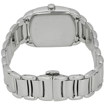 Silver-tone stainless steel case with a silver-tone stainless steel bracelet. Fixed silver-tone stainless steel bezel. Silver quilted dial with rose gold-tone hands and index hour markers. Index-arabic numerals. Dial Type: Analog. One- small second subdials. ETA Caliber 980.163 quartz movement. Scratch resistant sapphire crystal. Solid case back. Tonneau case shape, case size: 36 mm x 30 mm, case thickness: 7.85 mm. Band width: 18 mm. Water resistant at 50 meters / 165 feet. Functions: hour, minute, small second. Dress watch style. Watch label: Swiss Made. Hamilton American Classic Bagley Ladies Watch H12451155.