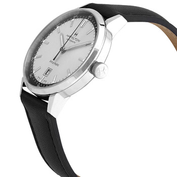 Stainless steel case with a black (calfskin) leather strap. Fixed stainless steel bezel. Beige and black dial with luminous silver-tone hands and index hour markers. Arabic numeral minute markers (at 5 minute intervals). Minute markers around the outer rim. Dial Type: Analog. Luminescent hands. Date display above the 6 o'clock position. Hamilton calibre H-10 automatic movement, based upon ETA C07.111, containing 25 Jewels, bitting at 21600 vph, and has a power reserve of approximately 80 hours. Scratch resistant sapphire crystal. Screw down crown. Solid case back. Round case shape. Case size: 40 mm. Band width: 20 mm. Tang clasp. Water resistant at 50 meters / 165 feet. Functions: date, hour, minute, second. American Classic Intra-matic Series. Dress watch style. Watch label: Swiss Made. Hamilton American Classic Intra-Matic Automatic Watch H38425720.