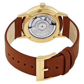 Gold-tone stainless steel case with a light brown leather strap. Fixed gold-tone stainless steel bezel. Brown sunray dial with gold-tone hands and index hour markers. Dial Type: Analog. Date display at the 6 o'clock position. ETA Caliber 2892-A2 Automatic movement, based upon ETA 2890, containing 21 Jewels, bitting at 28800 vph, and has a power reserve of approximately 42 hours. Scratch resistant sapphire crystal. Pull / push crown. Transparent case back. Round case shape, case size: 38 mm, case thickness: 9.8 mm. Band width: 20 mm. Tang clasp. Water resistant at 50 meters / 165 feet. Functions: date, hour, minute, second. Casual watch style. Watch label: Swiss Made. Hamilton American Classic Intra-Matic Automatic Men's Watch H38475501.