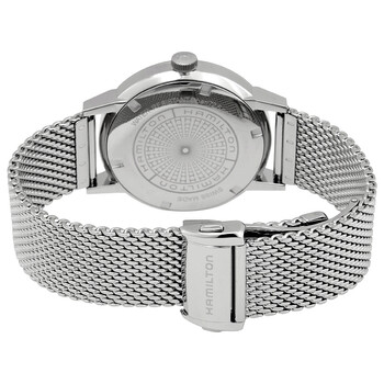 Stainless steel case with a stainless steel (Milanese) bracelet. Fixed stainless steel bezel. White dial with luminous silver-tone hands and index hour markers. Minute markers. Arabic numeral minute markers (at 5 minute intervals) around the outer rim. Dial Type: Analog. Date display at the 6 o'clock position. Hamilton calibre H-10 automatic movement, based upon ETA C07.111, containing 25 Jewels, bitting at 21600 vph, and has a power reserve of approximately 80 hours. Scratch resistant sapphire crystal. Round case shape. Case size: 40 mm. Band width: 20 mm. Fold over clasp. Water resistant at 50 meters / 165 feet. Functions: date, hour, minute, second. American Classic Intra-matic Series. Casual watch style. Watch label: Swiss Made. Hamilton American Classic Intra-Matic Automatic White Dial Men's Watch H38425120.