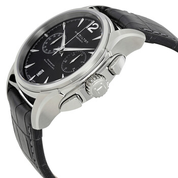 Silver-tone stainless steel case with a black leather strap. Fixed stainless steel bezel. Black dial with luminous silver-tone hands and index hour markers. Arabic numerals mark the 12 o'clock positions. minute markers around the outer rim. Dial Type: Analog. Luminescent hands and markers. Date display at the 6 o'clock position. Chronograph - two sub-dials displaying: 30 minute and 60 second. Hamilton Calibre H-31 Automatic movement, based upon ETA 7753, containing 27 Jewels, bitting at 28800 vph, and has a power reserve of approximately 60 hours. Scratch resistant sapphire crystal. Pull / push crown. Skeleton case back. Round case shape, case size: 42 mm, case thickness: 15 mm. Band width: 20 mm, band length: 7 inches. Tang clasp. Water resistant at 100 meters / 330 feet. Functions: chronograph, date, hour, minute, second. American Classic Jazzmaster Series. Sport watch style. Watch label: Swiss Made. Hamilton American Classic Jazzmaster Automatic Men's Watch H32606735.