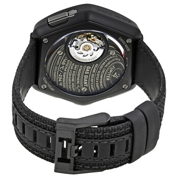 Black PVD titanium case with a black leather-lined textile strap. Fixed black PVD bezel. Jupiter (three time zone) dial with black hands and Arabic numeral hour markers. Dial Type: Analog. ETA caliber 2671 automatic movement with a 38-hour power reserve. Scratch resistant sapphire crystal. Transparent case back. Case dimensions: 49 mm x 52 mm. Case thickness: 12 mm. Round case shape. Band width: 24 mm. Tang clasp. Water resistant at 100 meters / 330 feet. Functions: date, hour, minute, second. Additional Info: limited edition of 999 pieces. Casual watch style. Watch label: Swiss Made. Hamilton American Classic ODC X-03 Limited Edition Jupiter Dial Men's Watch H51598990.