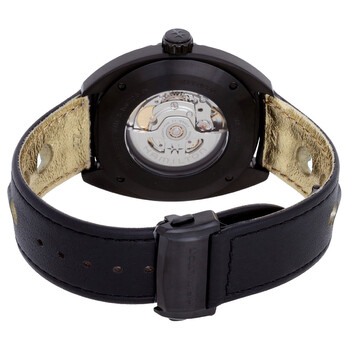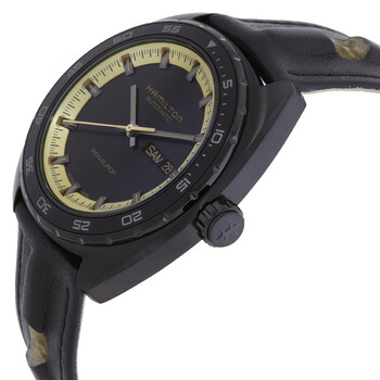 Black stainless steel case with a black leather strap. Fixed black stainless steel bezel. Black dial with black hands and index hour markers. Minute markers around the outer rim. Dial Type: Analog. Luminescent hands and markers. Day of the week and date display at the 3 o'clock position. Hamilton Calibre H-30 Automatic movement, based upon ETA C07.111, containing 25 Jewels, bitting at 21600 vph, and has a power reserve of approximately 80 hours. Scratch resistant sapphire crystal. Screw down crown. Transparent case back. Round case shape, case size: 42 mm, case thickness: 11.85 mm. Band width: 22 mm. Deployment clasp. Water resistant at 50 meters / 165 feet. Functions: date, day, hour, minute, second. American Classic Pan Europ Series. Sport watch style. Watch label: Swiss Made. Hamilton American Classic Pan Europ Automatic Black Dial Men's Watch H35425730.