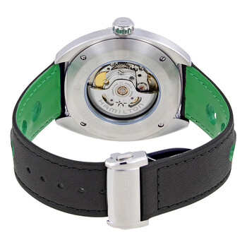 Stainless steel case with a black (green backed) leather strap. Fixed stainless steel bezel with a black top ring. Green dial with luminous silver-tone hands and index hour markers. Minute markers around the outer rim. Dial Type: Analog. Luminescent hands and markers. Day of the week and date display at the 3 o'clock position. Hamilton calibre H-30 automatic movement with an 80-hour power reserve. Scratch resistant sapphire crystal. Screw down crown. Transparent case back. Round case shape. Case size: 42 mm. Case thickness: 11.85 mm. Band width: 22 mm. Deployment clasp. Water resistant at 50 meters / 165 feet. Functions: date, day, hour, minute, second. Sport watch style. Watch label: Swiss Made. Hamilton American Classic Pan Europ Automatic Green Dial Men's Watch H35415761.