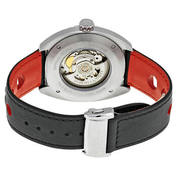 Stainless steel case with a black leather strap (red backed). Fixed stainless steel bezel with a black top ring. Grey dial with luminous silver-tone hands and index hour markers. Minute markers around the outer rim. Dial Type: Analog. Luminescent hands and markers. Day of the week and date display at the 3 o'clock position. Automatic movement with an 80-hour power reserve. Scratch resistant sapphire crystal. Push / pull crown. Skeleton case back. Case diameter: 42 mm. Case thickness: 12 mm. Round case shape. Band width: 22 mm. Band length: 8 inches. Deployment clasp. Water resistant at 50 meters / 165 feet. Functions: date, day, hour, minute, second. Casual watch style. Watch label: Swiss Made. Hamilton American Classic Pan Europ Automatic Grey Dial Black Leather Men's Watch H35415781.