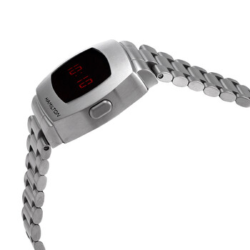Stainless steel case with a stainless steel bracelet. Fixed stainless steel bezel. Black digital dial displaying: hours and minutes. Dial Type: digital. Quartz movement. Scratch resistant sapphire crystal. Pull / push crown. Solid case back. Case dimensions: 40,8 mm x 34,7 mm. Case thickness: 13.5 mm. Band width: 24 mm. Fold over clasp. Water resistant at 100 meters / 330 feet. Functions: hour, minute. American Classic Psr Series. Sport watch style. Hamilton American Classic PSR Quartz Digital Men's Watch H52414130.