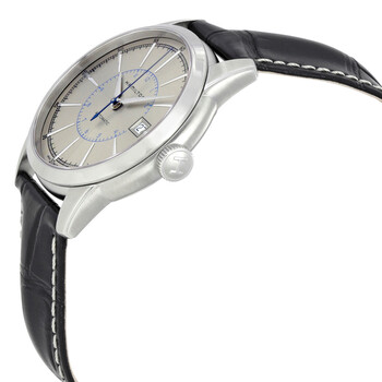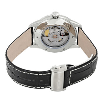 Stainless steel case with a black leather strap. Fixed stainless steel bezel. Silver dial with silver-tone hands and index / Arabic numeral hour markers. Minute markers. Arabic numeral minute markers (at 5 minute intervals) around the outer rim. Dial Type: Analog. Date display at the 3 o'clock position. Hamilton calibre H-10 automatic movement, based upon ETA C07.111, containing 25 Jewels, bitting at 21600 vph, and has a power reserve of approximately 80 hours. Scratch resistant sapphire crystal. Pull / push crown. Skeleton case back. Round case shape. Case size: 40 mm. Case thickness: 12 mm. Band width: 20 mm. Deployment clasp. Water resistant at 50 meters / 165 feet. Functions: date, hour, minute, second. American Classic Series. Dress watch style. Watch label: Swiss Movement. Hamilton American Classic Railroad Silver Dial Men's Watch H40555781.