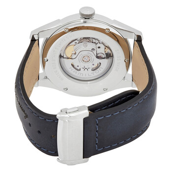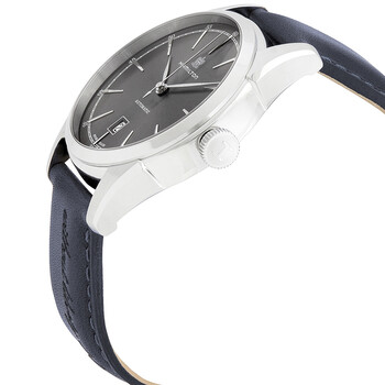 Stainless steel case with a blue leather strap. Fixed stainless steel bezel. Grey dial with silver-tone leaf-style hands and index hour markers. Minute markers. Arabic numeral minute markers (at 5 minute intervals) around the outer rim. Dial Type: Analog. Date display above the 6 o'clock position. Hamilton calibre H-10 automatic movement, based upon ETA C07.111, containing 25 Jewels, bitting at 21600 vph, and has a power reserve of approximately 80 hours. Scratch resistant sapphire crystal. Pull / push crown. Transparent case back. Round case shape. Case size: 42 mm. Case thickness: 11.4 mm. Band width: 22 mm. Deployment clasp. Water resistant at 50 meters / 165 feet. Functions: date, hour, minute, second. Casual watch style. Watch label: Swiss Made. Hamilton American Classic Spirit of Liberty Automatic Grey Dial Men's Watch H42415691.