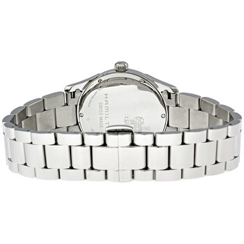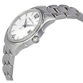 Silver-tone stainless steel case with a silver-tone stainless steel bracelet. Fixed silver-tone 60 diamond set bezel. Silver dial with silver-tone hands and index hour markers. Arabic numerals mark the 6 and 12 o'clock positions. Dial Type: Analog. Luminescent hands. Date display at the 3 o'clock position. ETA Caliber 955.412 quartz movement. Scratch resistant sapphire crystal. Solid case back. Round case shape, case size: 34 mm, case thickness: 8 mm. Band width: 16 mm. Deployment clasp. Water resistant at 50 meters / 165 feet. Functions: date, hour, minute, second, battery eol indicator. Additional Info: caliber reference on the back case. Dress watch style. Watch label: Swiss Made. Hamilton American Classics Jazzmaster Diamonds Ladies Watch H32381115.