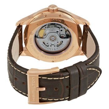 Rose gold-tone stainless steel case with a dark brown leather strap. Fixed rose gold-tone bezel. Silver guilloche dial with rose rose gold-tone dauphine-style shape hands and index hour markers. Arabic numerals mark the 6. 9 and 12 o'clock positions, Arabic numeral minute markers (at 5 minute intervals). Minute markers around the outer rim. Dial Type: Analog. Luminescent hands and markers. Date display at the 3 o'clock position. ETA caliber 2824-2 automatic movement, based upon ETA 2824, containing 25 Jewels, bitting at 28800 vph, and has a power reserve of approximately 38 hours. Scratch resistant sapphire crystal. Pull / push crown. Skeleton case back. Round case shape. Case size: 40 mm. Case thickness: 11 mm. Band width: 20 mm. Band length: 8 inches. Tang clasp. Water resistant at 50 meters / 165 feet. Functions: date, hour, minute, second. Additional Info: in general, suitable for short periods of recreational swimming, but not diving or snorkeling. Casual watch style. Watch label: Swiss Made. Hamilton American Classics Jazzmaster Viewmatic Men's Watch H32645555.