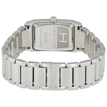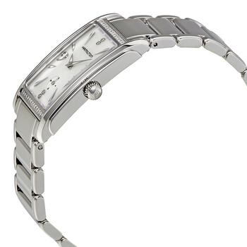 Stainless steel case with a stainless steel bracelet. Fixed stainless steel diamond-set bezel. Mother of pearl dial with silver-tone hands and index hour markers. Diamonds set at the 6 and 12 o'clock positions. Arabic numerals mark the 3 and 9 o'clock positions. Dial Type: Analog. Small seconds sub-dial subdials. Swiss quartz movement. Scratch resistant sapphire crystal. Pull / push crown. Solid case back. Case dimensions: 26 mm x 39 mm. Case thickness: 7 mm. Rectangle case shape. Band width: 17 mm. Band length: 8 inches. Push button deployment clasp. Water resistant at 30 meters / 100 feet. Functions: hour, minute, second. Luxury watch style. Watch label: Swiss Made. Hamilton Ardmore Mother of Pearl Dial Diamond Ladies Watch H11491115.