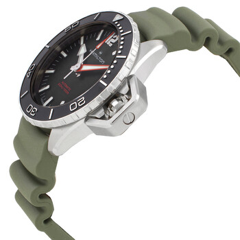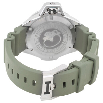 Silver-tone stainless steel case with a khaki green silicone strap. Uni-directional rotating silver-tone stainless steel bezel. Black dial with luminous silver-tone with orange tip minute and second hands. hands and index hour markers. Minute markers around the outer rim. Dial Type: Analog. Luminescent hands and markers. Automatic movement with an 80 power reserve. Scratch resistant sapphire crystal. Screw down crown. Solid case back. Round case shape, case size: 41 mm, case thickness: 13.09 mm. Band width: 20 mm. Buckle clasp. Water resistant at 300 meters / 1000 feet. Functions: hour, minute, second. Dive watch style. Watch label: Swiss Made. Hamilton Automatic Black Dial Watch H77455331.