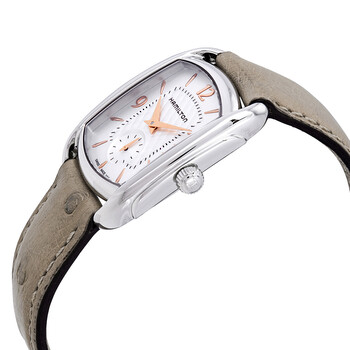 Silver-tone stainless steel case with a beige (genuine ostrich) leather strap. Fixed silver-tone stainless steel bezel. Silver quilted dial with rose gold-tone hands and index hour markers. Arabic numerals appear at the 3, 9 and 12 o'clock positions. minute markers around an inner ring. Dial Type: Analog. Small seconds subdials. ETA Caliber 980.163 quartz movement. Scratch resistant sapphire crystal. Pull / push crown. Solid case back. Rectangle case shape, case size: 36 mm x 30 mm, case thickness: 7 mm. Band width: 18 mm, band length: 7 inches. Tang clasp. Water resistant at 50 meters / 165 feet. Functions: hour, minute, small second. Casual watch style. Watch label: Swiss Made. Hamilton Bagley Silver Dial Beige Ostrich Leather Ladies Watch H12451855.