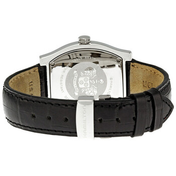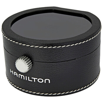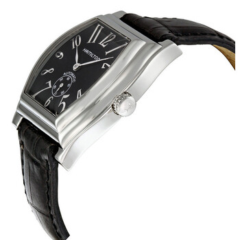 Stainless steel case with a black leather strap. Fixed bezel. Black dial with silver-tone hands and Arabic hour markers. Date display appears at the 3 o'clock position. Small seconds sub-dial. Automatic movement. Scratch resistant sapphire crystal. Case diameter: 35 mm x 38 mm. Case thickness: 10 mm. Triple folding clasp. Water resistant at 30 meters/ 100 feet. Functions: hours, minutes, seconds, calendar. Hamilton Black Dial Stainless Steel Case Automatic Men's Watch H623322.