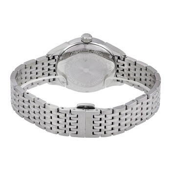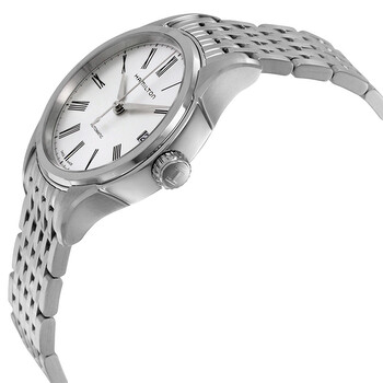 Stainless steel case with a stainless steel bracelet. Fixed stainless steel bezel. White dial with silver-tone hands and Roman numeral hour markers. Minute markers around the outer rim. Dial Type: Analog. Date display at the 3 o'clock position. Automatic movement with a 38-hour power reserve. Scratch resistant sapphire crystal. Case diameter: 34 mm. Case thickness: 10.58 mm. Round case shape. Band width: 16 mm. Deployment clasp. Water resistant at 50 meters / 165 feet. Functions: date, hour, minute, second. Casual watch style. Hamilton Classic Jazzmaster Valiant White Dial Stainless Steel Ladies Watch H39415154.
