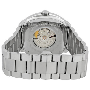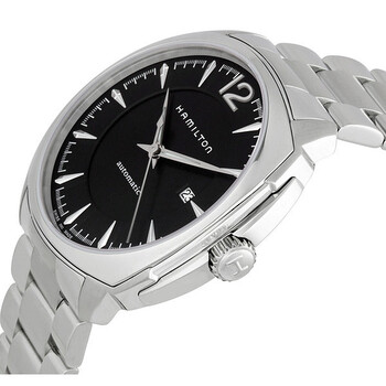Stainless steel case with a stainless steel bracelet. Fixed stainless steel bezel. Black dial with silver-tone hands and index hour markers. Arabic numeral marks the 12 o'clock position. Minute markers around the outer rim. Date display appears at the 3 o'clock position. Automatic movement. Scratch resistant sapphire crystal. Solid case back. Case diameter: 43 mm. Deployment clasp. Water resistant at 100 meters/ 330 feet. Functions: hours, minutes, seconds, date. Hamilton Cushion Automatic Black Dial Stainless Steel Men's Watch H36515135.
